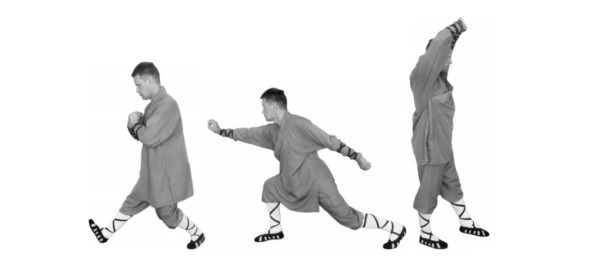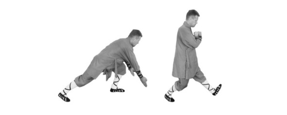 Вдыхая, повернитесь вправо и скрестите ладони на уровне нижнего «даньтянь». Продолжая вдох, поднимите ладони до положения над головой и начните опускать через стороны вниз. Шагните вперед правой ногой и наклонитесь немного вперед, проводя руками круг до положения возле груди, при этом центр тяжести сместите на заднюю левую ногу, а носок правой стопы поднимите вверх. Руки в кулаках скрестите возле груди, при этом большой палец на обеих руках накрывает указательный и средний пальцы, остальные пальцы чуть согнуты. Руки согнуты в локтях, центры кулаков развернуты вовнутрь. Сконцентрируйте внимание на точке «байхуэй» (акушка). Медленно выдыхая, сделайте движение вперед правым кулаком (указательный и средний пальцы соприкасаются), а левым кулаком назад. При этом сместите центр тяжести на переднюю правую ногу, левая задняя нога выпрямлена и стоит пяткой вверх. Представьте, что Ци устремляется в кончики пальцев правого кулака, а также сконцентрируйте внимание на точке «иньтан» (точка между бровями). В этом положении находиться 30 секунд, дыхание обратное. Вдыхая, повернитесь влево и скрестите ладони на уровне нижнего «даньтянь». Продолжая вдох, поднимите ладони до положения над головой и начните опускать через стороны вниз. Шагните вперед левой ногой и наклонитесь немного вперед, проводя руками круг до положения возле груди, при этом центр тяжести сместите на заднюю правую ногу, а носок левой стопы поднимите вверх. Руки в кулаках скрестите возле груди, при этом большой палец на обеих руках накрывает указательный и средний пальцы, остальные пальцы чуть согнуты. Руки согнуты в локтях, центры кулаков развернуты вовнутрь. Сконцентрируйте внимание на точке «байхуэй» (макушка). Медленно выдыхая, сделайте движение вперед левым кулаком (указательный и средний пальцы соприкасаются), а правым кулаком назад. При этом сместите центр тяжести на переднюю левую ногу, правая задняя нога выпрямлена и стоит пяткой вверх. Представьте, что «ци» устремляется в кончики пальцев левого кулака, а также сконцентрируйте внимание на точке «иньтан» (точка между бровями). В этом положении находиться 30 секунд.