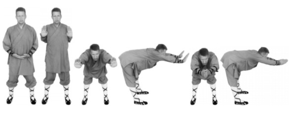 Медленно вдыхая, поднимите ладони прямо перед собой до уровня груди. Центры ладоней направлены вверх, пальцы – вперед. Медленно выдыхаете через рот (округлив губы) с произношением звука «ту». Одновременно разверните ладони центрами вниз и сделайте медленное давящее движение вниз до положения ниже бедер. Согните колени, спина выпрямлена, корпус расслаблен. Кончик языка поднимите к верхнему небу, глаза широко открыты без напряжения, смотрите вперед. В этом положении находитесь от полминуты до одной минуты, дыхание нижнее. Медленно вдыхая, опять поднимите руки центром ладоней вверх до уровня груди и распрямите ноги в коленях. Медленно выдыхаете через рот (округлив губы) с произношением звука «ту». Одновременно поверните ладони центрами вниз и сделайте медленное давящее движение вниз до положения ниже бедер. Согните колени и опуститесь ниже первого раза, спина выпрямлена, корпус расслаблен. Кончик языка поднимите к верхнему небу, глаза широко открыты без напряжения, смотрите вперед. В этом положении находитесь от полминуты до одной минуты, дыхание нижнее. Медленно вдыхая, опять поднимите руки центром ладоней вверх до уровня груди и распрямите ноги в коленях. Медленно выдыхаете через рот (округлив губы) с произношением звука «ту». Одновременно поверните ладони центрами вниз и сделайте медленное давящее движение вниз. Ноги сгибаются в коленях до тех пор, пока ладони и колени не коснутся земли. После этого касания ладонями и коленями земли кончиком языка коснитесь к верхнему небу. Немного прогните спину, глаза открыты, смотрите вперед. В этом положении находитесь от полминуты до одной минуты, дыхание нижнее.