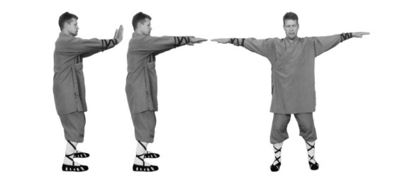 Вдыхая, медленно опускаем ладони через стороны вниз, центр тяжести перенести с носков в естественное положение. После этого ладони развернуть центрами вперед, руки согнуть в локтях и поднять предплечья вверх, при этом прижать локти к корпусу. Центры ладоней развернуть вверх, взгляд вперед. Мысленно сконцентрировать внимание на точке «лаогун». Выдыхая, медленно сделать отталкивающее движение ладонями вверх, пальцы ладоней направить назад, взгляд – вперед. Продолжая выдох, центр тяжести перенести на носки, оторвать пятки от земли.