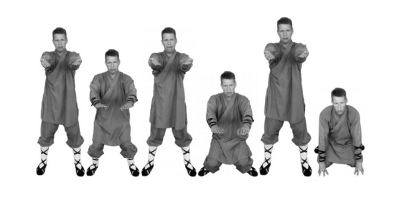 На вдохе поднимите медленно ладони по центру вдоль корпуса вверх до положения над головой, смотрите на ладони. Медленно выдыхая, поверните корпус вправо на 90 градусов, одновременно с этим опускаете руки через стороны вниз и слегка наклоняете корпус вперед, при этом руки с открытыми ладонями распрямляются вперед вниз (центры ладоней направлены вверх). Вдыхая, медленно перенесите центр тяжести на заднюю ногу, носок правой ноги оторвите от земли. Одновременно опустите ладони на бедра, центры ладоней направлены вперед вверх, корпус слегка наклоните назад. Продолжая вдох, опустите ладони назад вниз и начните их поднимать по кругу вверх. Ладони в этом движение принимают форму «когти тигра». Подняв «когти тигра» над головой, сразу переходите на выдох. Руки начинают давящее движение вперед и вниз. Сначала делаете движение вниз медленно, затем выполняете с небольшим ускорением. Одновременно верхнюю часть корпуса наклоните вперед и согните правую ногу в колене, при этом левую ногу оттяните назад с опорой на носок. Упритесь пальцами ладоней в землю. Сконцентрируйте внимание на кончиках пальцев. В этом положении находиться 30 секунд. Можно сделать в это время еще вдох и выдох, выдох выполняете через рот. Вдыхая, поднимитесь и повернитесь влево на 180 градусов. Одновременно ладони поднимите по центру вдоль корпуса до положения над головой.