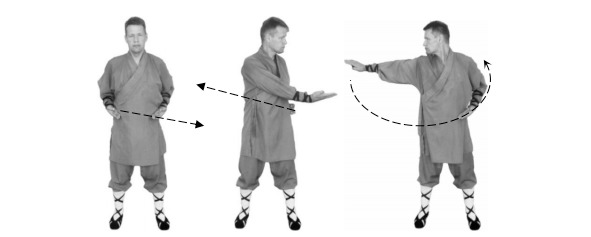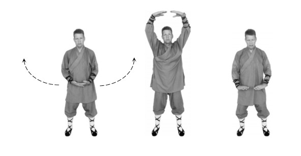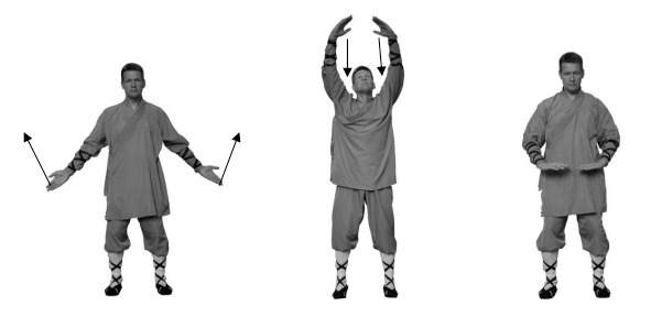 Медленно вдыхая, выпрямите корпус и поднимите ладони через стороны вверх до положения над головой, смотрите на ладони. Медленно выдыхая, опустите ладони через стороны вниз до положения перед нижним «даньтянь».
