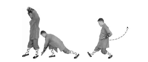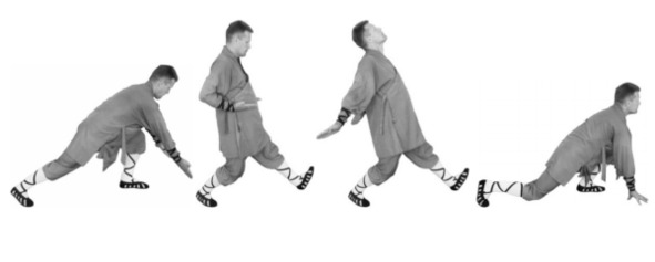Медленно выдыхая, опустите руки через стороны вниз и слегка наклоните корпус вперед, при этом руки с открытыми ладонями распрямляются вперед вниз (центры ладоней направлены вверх). Вдыхая, медленно перенесите центр тяжести на заднюю ногу, носок левой ноги оторвите от земли. Одновременно опустите ладони на бедра, центры ладоней направлены вперед вверх, корпус слегка наклоните назад. Продолжая вдох, опустите ладони назад вниз и начните их поднимать по кругу вверх. Ладони в этом движении принимают форму «когти тигра». Подняв «когти тигра» над головой, сразу переходите на выдох. Руки начинают давящее движение вперед и вниз. Сначала делаете движение вниз медленно, затем выполняете с небольшим ускорением. Одновременно верхнюю часть корпуса наклоните вперед и согните левую ногу в колене, при этом правую ногу оттяните назад с опорой на носок. Упритесь пальцами ладоней в землю. Сконцентрируйте внимание на кончиках пальцев. В этом положении находиться 30 секунд. Можно сделать в это время еще вдох и выдох, выдох выполняете через рот. В самой нижней позиции представьте поток энергии «ци» из области таза по позвоночнику вверх и выдыхаете через нос или рот.