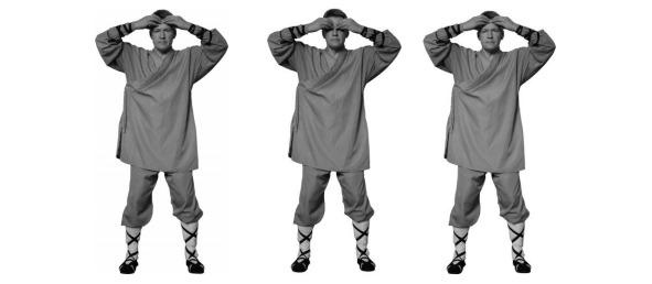 На выдохе поднимитесь и разверните ступни и корпус на 90 градусов вправо. Медленно вдыхая, поднимите ладони по центру вдоль корпуса вверх до положения над головой, смотрите на ладони. На выдохе опустите ладони через стороны вниз до положения возле «даньтянь». Медленно вдыхая, поднимите ладони через стороны вверх до уровня плеч, после чего согнув руки в локтях, расположите пальцы на затылке, центрами ладоней закройте уши. Медленно выдыхая через рот, наклоните корпус вперед, спина расслаблена, ноги в коленях прямые. Наклон сделайте до уровня бедер, при этом легко нажмите ладонями на уши. Смотрите на стопы. В этом положении находитесь 30 секунд. Медленно вдыхая, поднимите корпус вверх. Не останавливаясь, сделайте медленный выдох с опусканием корпуса опять вниз до уровня колен, при этом сделайте легкое надавливание пальцами на затылок. Смотрите на стопы. В этом положении находитесь 30 секунд. Медленно вдыхая, поднимите корпус вверх. Не останавливаясь, сделайте медленный выдох с опусканием корпуса вниз до положения ниже коленей. Смотрите на стопы. В этом положении находитесь 30 секунд. Дыхание естественное.