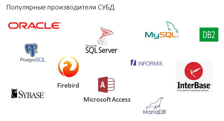 Ниже список популярных производителей Систем Управления Базами Данных: