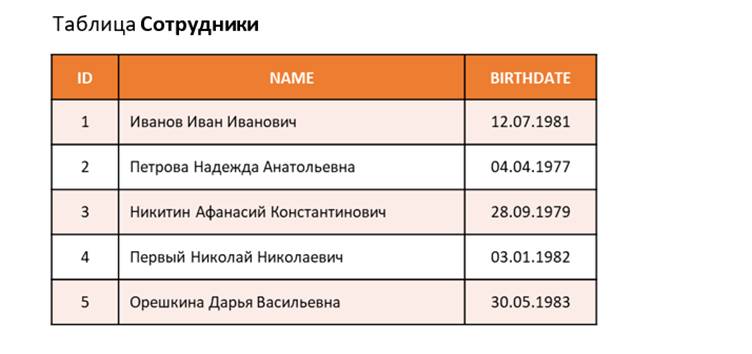 С первого взгляда все понятно, верно? В этой таблице три столбца – ID, NAME и BIRTHDATE.