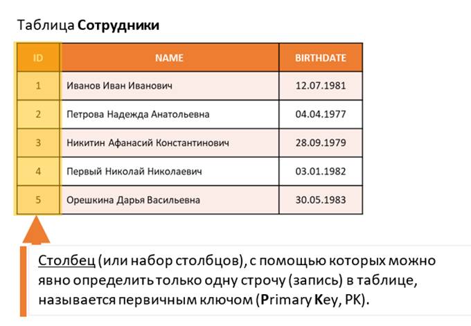 Столбец или набор столбцов, с помощью которых можно явно определить только одну строчку (запись) в таблице, называется первичным ключом (Primary Key, или сокращенно PK). В нашем примере, это специально созданный (для идентификации) столбец ID.