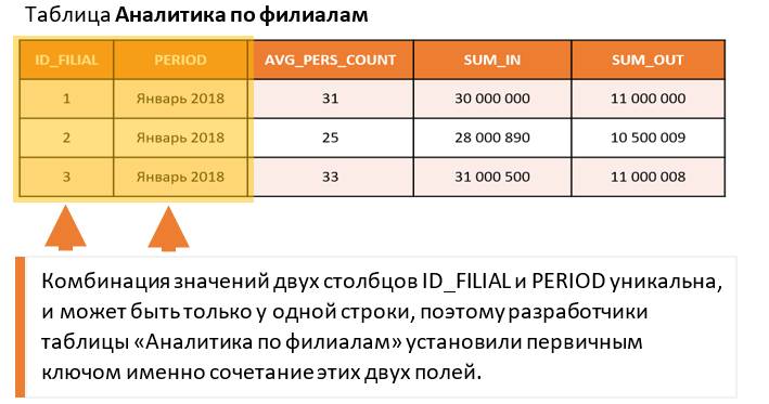 Если смотреть значение только в графе ID_FILIAL, то мы обнаружим, что оно повторяется. Конечно, ведь данные по одному филиалу вносились каждый месяц. Значение идентификатора филиала повторяется, но в сочетании со значением столбца PERIOD – оно уникально! Со значением ID_FILIAL = 1 и PERIOD = Январь 2018 есть только одна строчка. Также как и со значением ID_FILIAL = 3 и PERIOD = Февраль 2018.