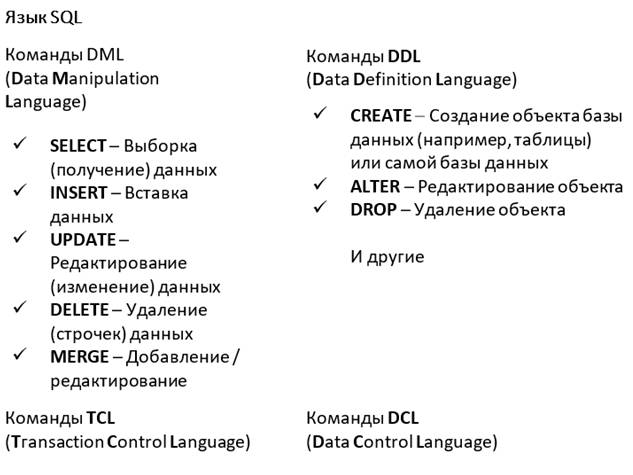 К группе команд DML относятся команды: SELECT – выбрать/прочитать информацию из таблицы/таблиц, INSERT – вставить новые строчки с данными, UPDATE – изменить, хранящиеся в таблице данные, команда DELETE – удалить строчки с данными, и команда MERGE – вставить/обновить данные в таблице.