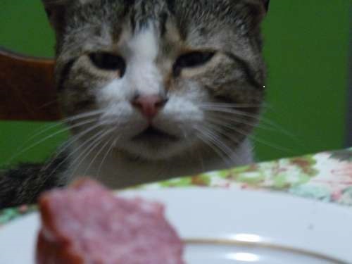 Надкусанная людьми колбаса мирно лежит на тарелке, которая стоит на столе. Хозяйка дома грозит коту расправой, если тот в очередной раз попытается что-то стащить со стола. Но при этом она берет колбасу и кладет её на стол ближе к животному, пытаясь приучить кота к порядку и терпению.