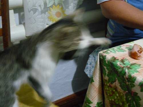 – Ты зачем у меня колбасу отнял?! Даже змея животных не трогает, пока те едят или пьют воду! Она же в моих лапах побывала и на полу повалялась, зачем тебе она? Да и вы всё утро ей наслаждались! Я же ничего не сказал пока вы её ели, даже не мяукнул, только сидел, мурлыкал и облизывался. Отдай немедленно колбасу, слышь …, отдай и всё!