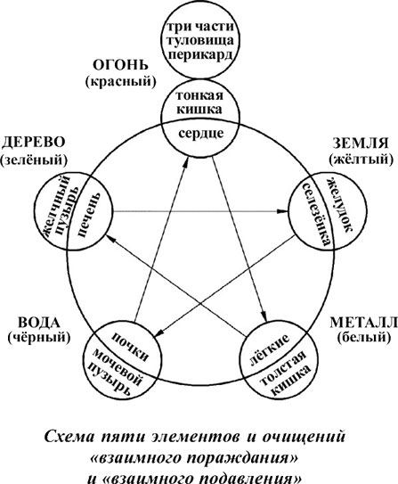 Рис. № 1. Схема пяти элементов и очищений «взаимного порождения» и «взаимного подавления»