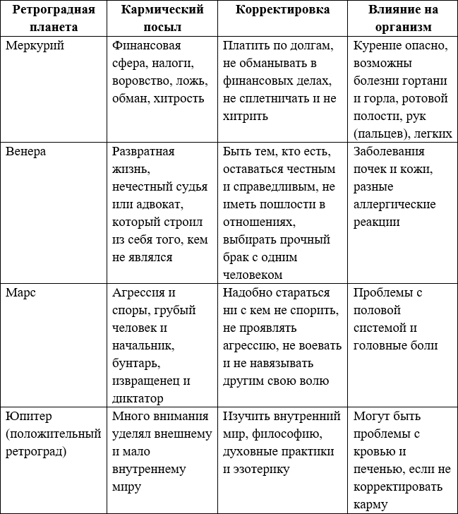 Ретроградная планета в астрологической карте может быть одна, но их может быть и несколько в разных силах и положениях относительно Луны, Солнца, фиктивных точек и других планет. Это оказывает в разной степени влияние на кармическую программу. Медитация является универсальным методом уравнивания энергий и самым верным подходом к пониманию себя и жизненных задач практическим путем.