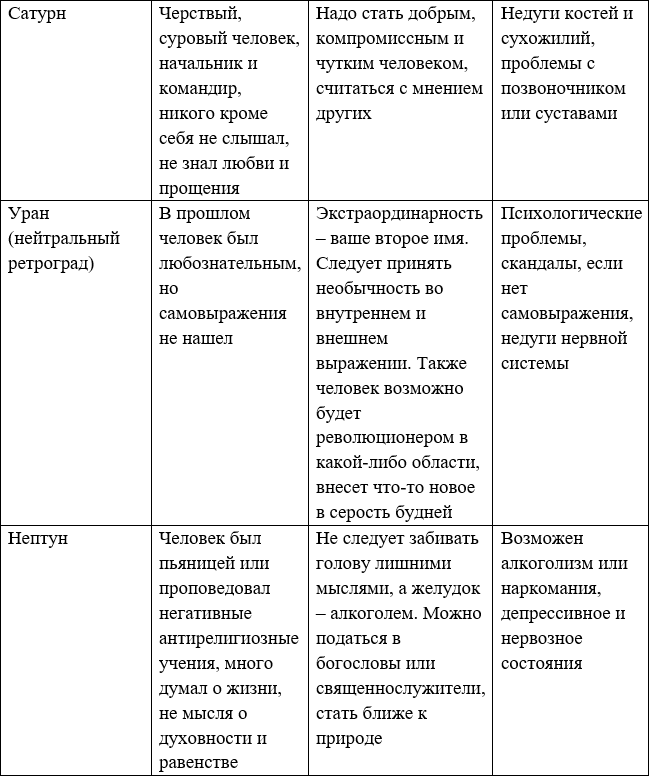 СатурнТяжелая, мрачная планета ограничений, энергии которой направлены на создание и соблюдение закона и порядка, где каждый человек и каждая вещь на своем месте. Сатурн есть старец, не всегда мудрый, но часто сварливый и нежелающий слушать никого, кроме себя, поэтому люди Сатурна весьма уперты и строги. Также планета несет энергии судьбы и кармы. В теле проявляется в виде костей скелета и сухожилий. Они будут гнуть человека к земле, мол, знай смиренное место. Под влиянием планеты бывают проблемы с позвоночником, могут понадобиться массажи.