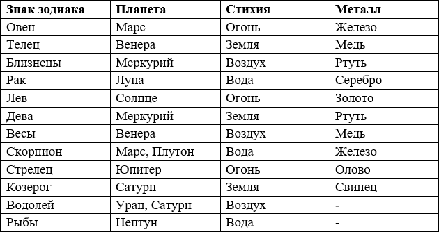 Таблица № 3. Знаки зодиака и планеты, стихии, металлы, которые им соответствуют