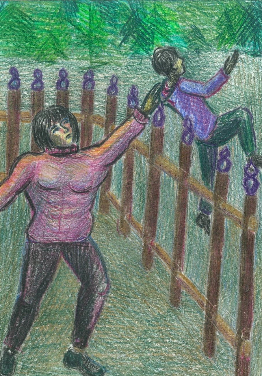 Парни продолжили побег, направились в лесок, находящийся прямо за участком. Я ухватилась за железные решётки забора, оттолкнулась от нижней перекладины ногой и вмиг взмыла вверх, сразу нащупав второй ногой уже верхнюю перекладину. На этот раз я пролетела над забором, приземлилась на ноги и сразу, не теряя ни секунды, продолжила преследование.