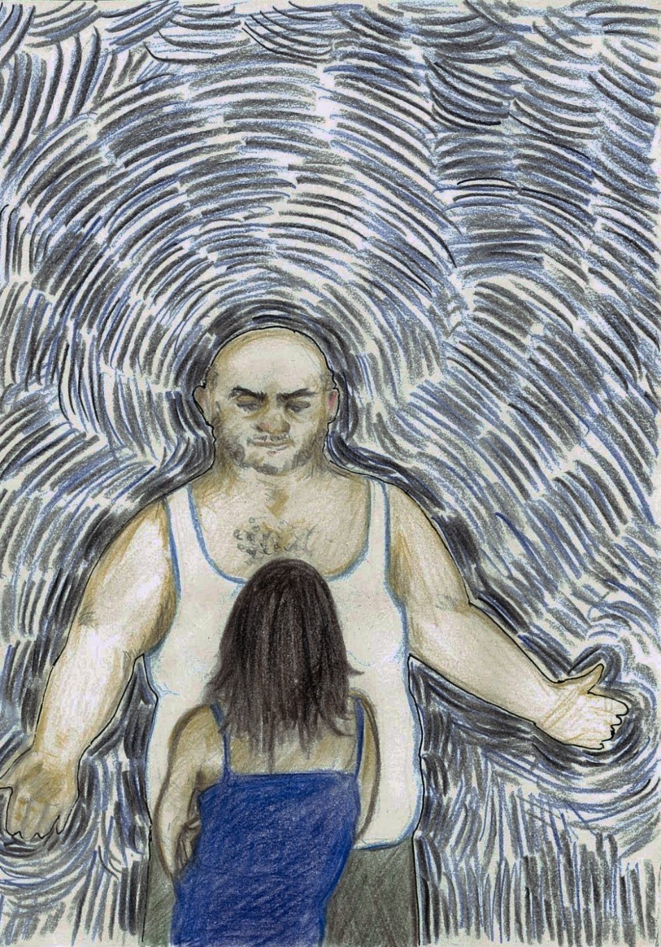 Но я не успела повернуться, как врезалась в чьё-то массивное тело. Человек был в грязной майке, с трудом натянутой на толстый живот, в штанах была огромная дыра на колене. Дернув головой, он дрогнул своими двумя подбородками. Голова лысела, но зато волосы на бороде и бакенбардах были жёсткими и ровными. Человек брился, оставляя лишь бакенбарды, на месте усов и бороды была лишь дневная щетина. Он смотрел на меня своими рыжевато-карими глазами, поедал меня своим взглядом.