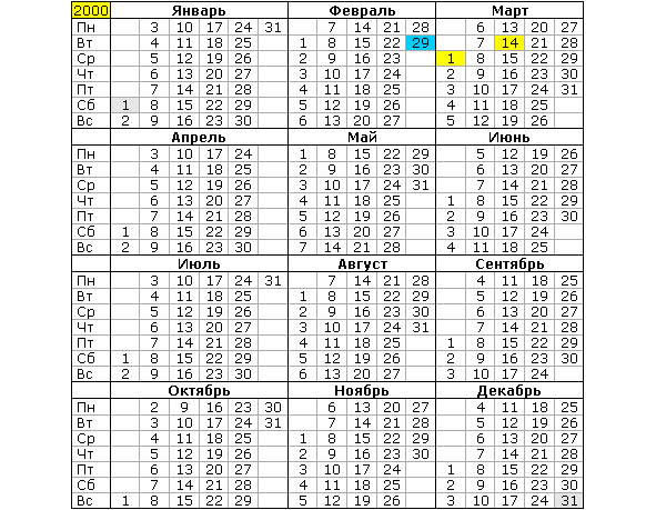 2000 год был високосным (високосный день – 29 февраля). Я взял наш Григорианский календарь (январского стиля) для наглядного пояснения календарных правил.