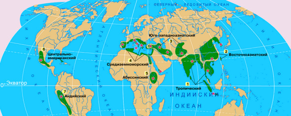 5.– Переднеазиатский. Здесь зародились разные виды пшеницы, ячмень, рожь, роза, инжир.