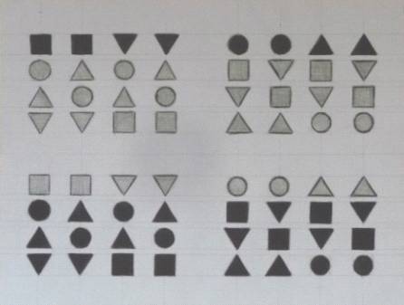 Каждый из четырёх значков, в таблице означает стихию. Одну из четырёх, как и в астрологии. Астрологию, древнейшую, можно сказать, ещё протонауку, реликт самых первых человеческих знаний о самом себе, предшественницу современной психологии, мы не будем излагать. Она и поныне развивается в бесчисленных вариантах, не всегда, на наш взгляд, удачных, и её азы обычно знает каждый культурный человек. Этого совершенно достаточно для предстоящих рассуждений. А вот на стихиях (наконец-то) остановимся подробно и не один раз. Можно сказать, понятие стихии – главный "инструмент" теперешнего нашего изложения. Мы должны научиться мыслить на этом уровне. Без этих основных, обобщающих весь мир, понятий не может быть понимания системы. Эстетическая концепция "девственников", определяющая направление и в жизни, и в искусстве, тоже опирается на понятие стихий. Итак, вот то, что изображает каждый значок. Квадратик – вода. Кружок – земля. Треугольник с углом вверху – воздух. Перевернутый треугольник, с углом внизу – огонь.