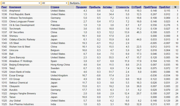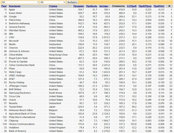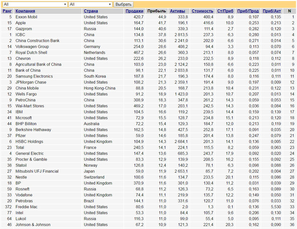 Теперь компании отсортированы по убыванию Прибыли. Еще больше интересной информации появилось. На третьем месте родной Gazprom с прибылью, вполне сопоставимой с Apple и Exxon Mobil, но «стоящий» почти в 4 раза меньше. На предыдущем экране выдачи его и в помине не было. У Вас вопросы возникли? У автора, когда он это первый раз увидел – возникли.