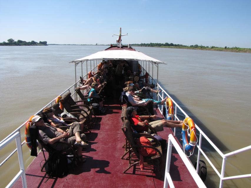 Внизу закрытые окна, и никого. Иравади – главная река страны: широкая, полноводная, спокойная. По берегам в густой тропической зелени виднеются много Буддистских храмов и монастырей, точнее, их верхушки.