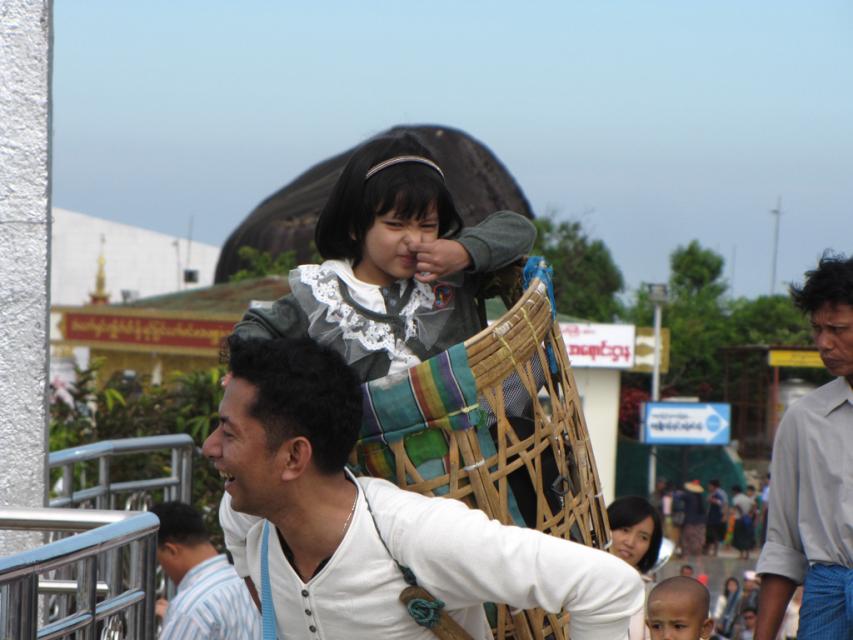 Толпа увлеченно двигалась к святыне. Все обустроено очень здорово и красиво. Еще на подходе виден этот камень. Его высота 25-27 метров (вместе с маленькой пагодкой на нем, высотой 7 метров). Облеплен пластинками из суссального золота во много слоев. Вошли на покрытую мраморными плитами площадь, на которой едят и даже спят, чтобы у святыни встретить рассвет. Вокруг расположились небольшие красивые дома: учебный центр, помещение для нирваны (по нашему – впадать в прострацию). А дальше несколько ступеней вниз – и Он, золотой и святой, почти рядом. Но женщинам (по определению грешным) подходить ближе, чем на 10 метров, нельзя, чтобы не притронуться: боятся, что упадет. А вот мужчины прилипают к нему лбом, лицом, плечами, грудью и стоят в оцепенении.