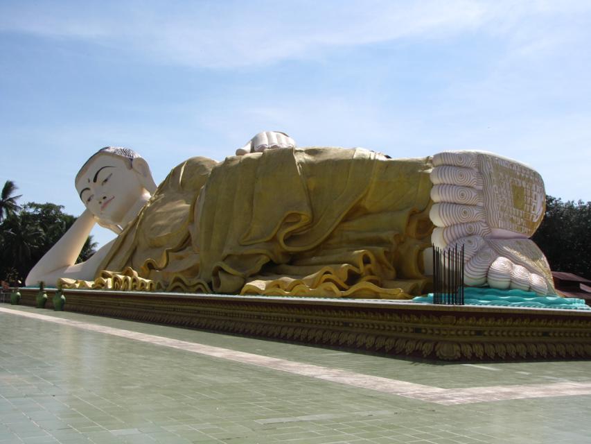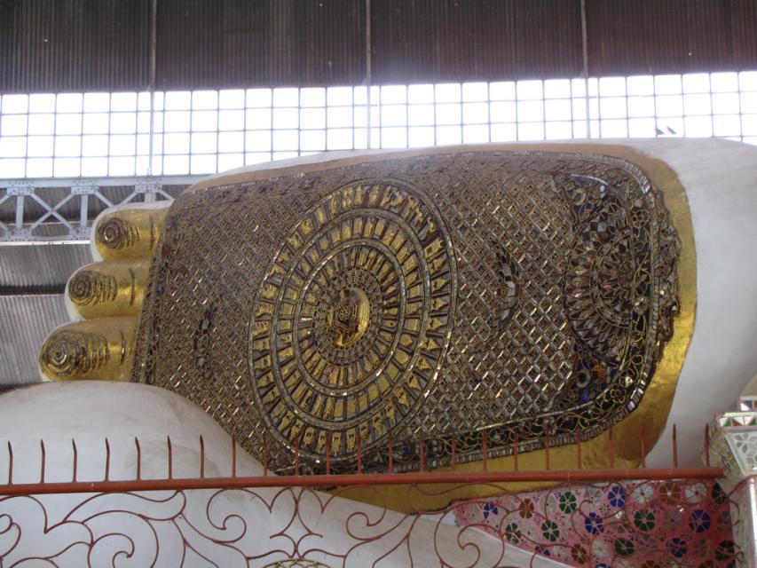 Первый же храм Швеха луанг поразил роскошью и богатством украшения лежащего Будды Скульптура огромна: 55 метров в длину и 16 в высоту. Так что сначала Будду уложили, а потом над ним соорудили храм. Строение старое: 994 года. Но реконструкции, видно, здесь проводят регулярно, все в прекрасном состоянии и богато. Будда, возлегая, смотрит с высоты, и украшен драгоценными камнями. А его стопы демонстрируют все это богатство. На постаменте множество табличек: это фамилии тех, кто пожертвовал на храм. От 1 доллара до …
