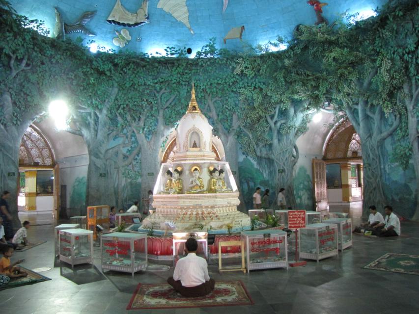 Изумительной красоты храм, и внешне, и внутренне. Там нет изображений Будды. Купол – это небо, но с какими-то знаками, а стены расписаны, как будто лес: везде деревья. Бирманцы не любят его, людей там мало.