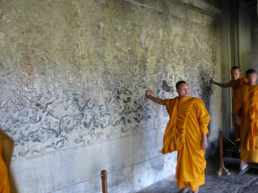 – Сам Ангкор Ват очень большой. Говорят, что чуть ли не самый большой в мире. Его изображение в Камбодже везде: на границе, на флаге, на деньгах. Сначала подъехала к насыпи через широкий канал и пошла к нему, такому величественному. Наверх уже не поднималась, обошла мраморный бассейн, огромные каменные панно. Ничего не поняла, но внимательно рассматривала и прониклась интересом к ним. Потом почитаю в интернете подробно. Он посвящен богу Вишну, (король, имя сложное), который его построил, там и похоронен. И все храмы (много квадратных километров) не предназначались для жизни: только для служения Богу. Интересно, имена архитекторов известны?