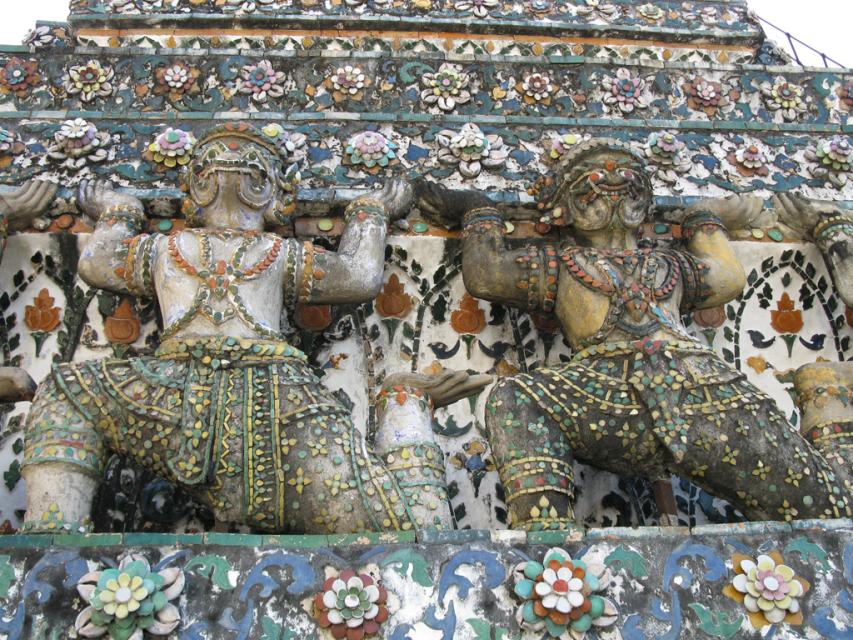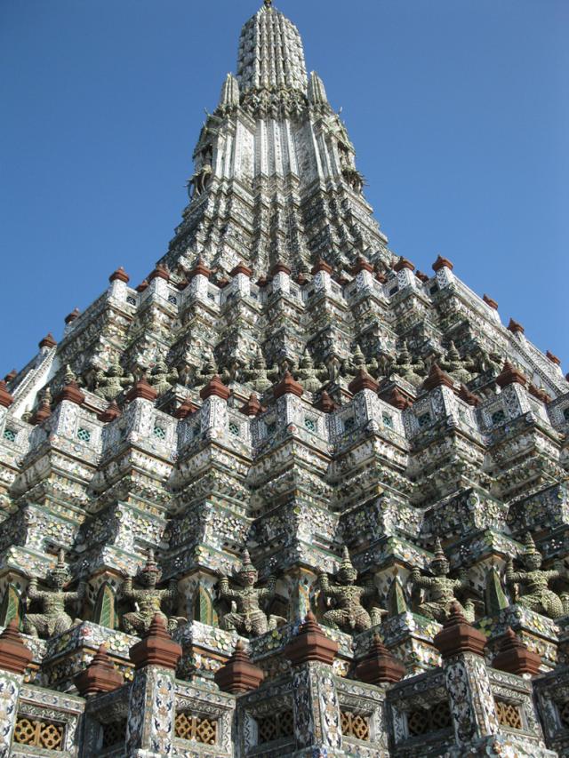 Главный пранг Ват Аруна и четыре малых пранга, окружающие его, покрыты кусочками фарфора, складывающиеся в удивительную разноцветную мозаику.