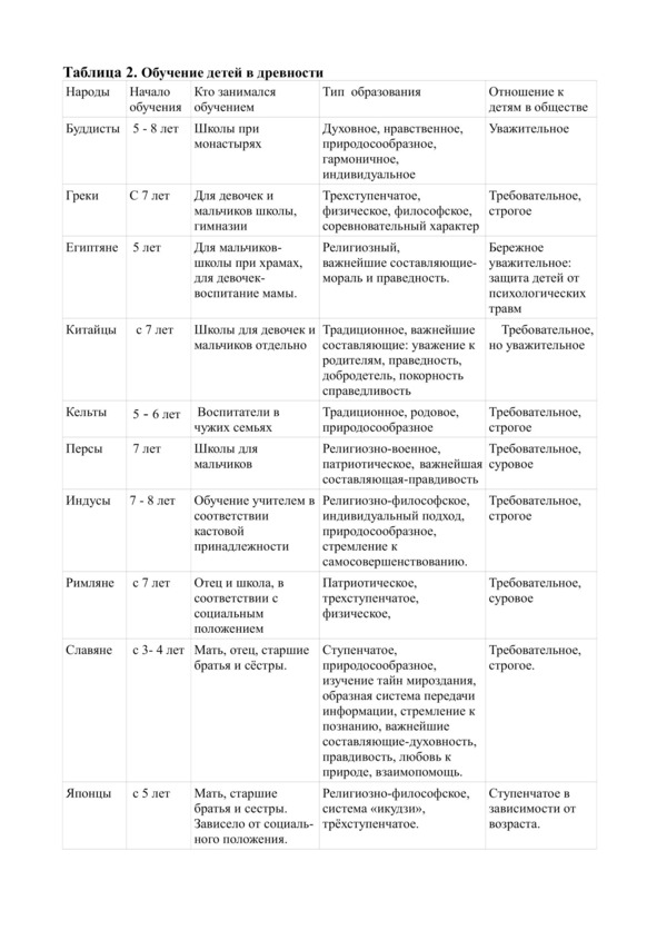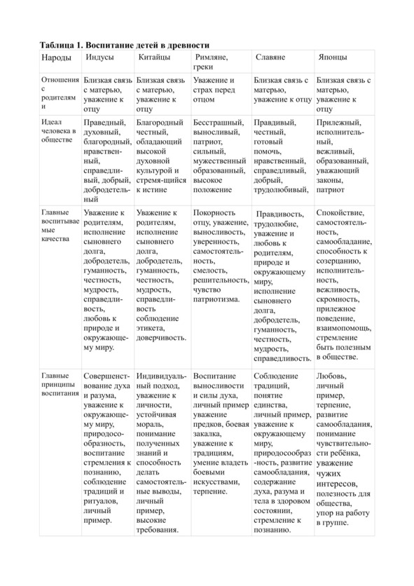 Но при этом, методы воспитания и обучения детей в славянской традиции вобрали в себя все лучшие черты этих идеалов и их можно назвать практически совершенными. (См. таблицы 1 и 2). Конечно, с давних времён утекло много воды, но вода в наших озёрах и реках от этого не стала чище и слаще. Современное человечество потеряло гораздо больше, чем обрело.