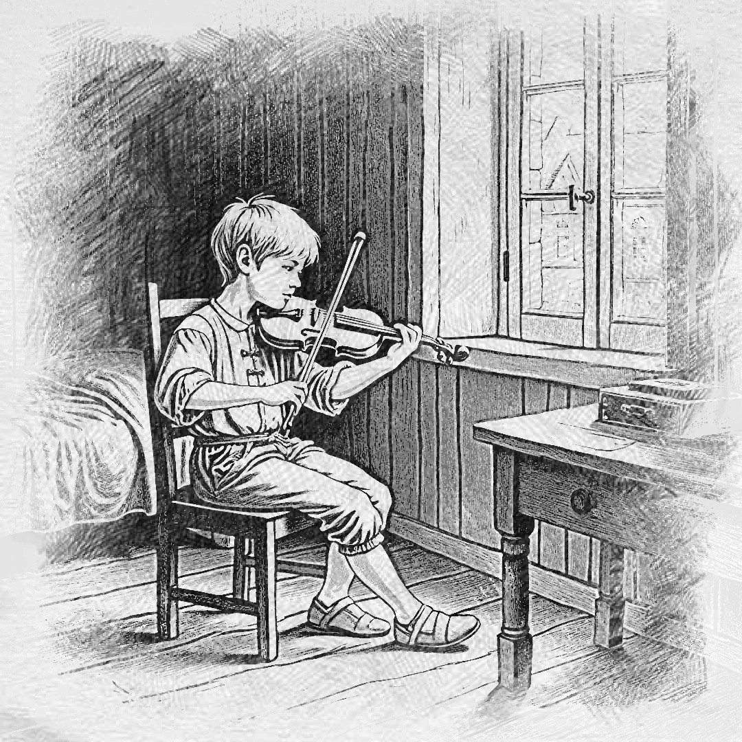 Окно в комнате Дени выходило на узкую улицу, где днём раздавался грохот повозок и звуки шагов прохожих по деревянным настилам, а ночью всё погружалось в волшебную тишину. И только свет Луны мягко пробивался сквозь старые ставни, освещая небольшую комнату, где стояли простая деревянная кровать, шкаф и небольшой стол. На этом столе всегда лежала его скрипка – старенькая, потёртая, но такая дорогая для Дени.