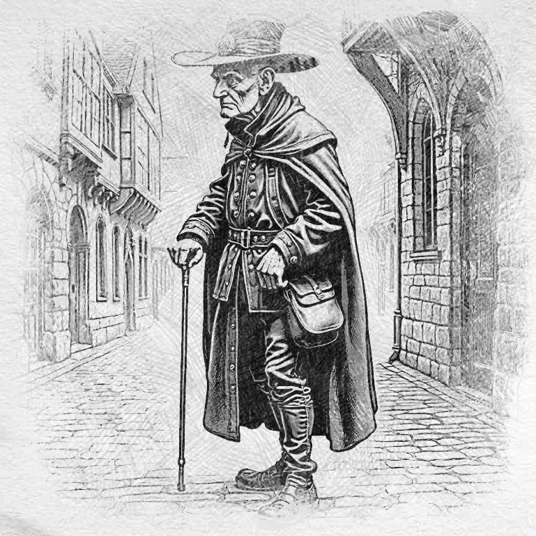 Одежда Казначея была приличной, но старой. На его плечах покоилась длинная мантия из чёрного сукна, которую он носил с таким видом, словно это была самая дорогая ткань в городе. Под мантией виднелась туника из тёмного льна, простая, но строгая, аккуратно зашитая в местах износа, а поверх неё – дублет из старого, но хорошо выделанного бархата с выцветшими узорами.