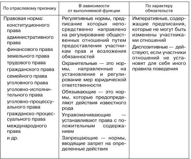 Нормы права подразделяются на следующие виды: управомочивающие (предоставляющие возможность действовать), обязывающие (требующие определенного, должного поведения) и запрещающие (устанавливающие запреты на совершение каких-либо действий или бездействия). Нормы права можно классифицировать также по отраслям (гражданского, уголовного, административного права и т. д.), в зависимости от действия в пространстве (общего действия и местного действия) и др.