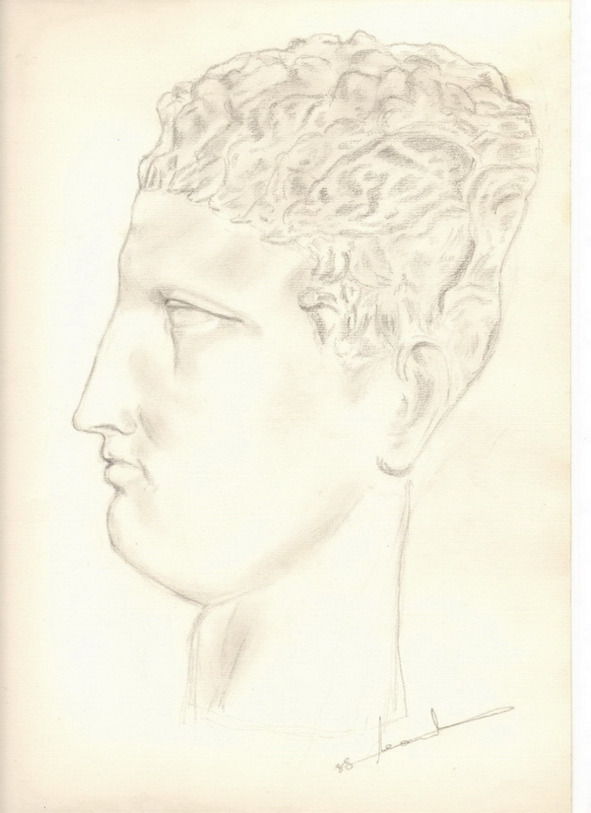 Решил учиться сам. Для этой цели я купил в подвалах того института гипсовую голову древнего грека у голодных студентов, всего за 10 рублей и притащил её в Архангельск. Голову повесил на шуруп, ввинченный в стенку и начал рисовать. Рисовать гипсовую голову- сложно. Сложнее, чем с натуры чью-то голову.
