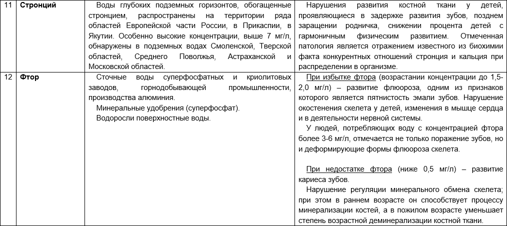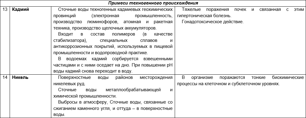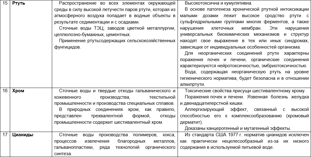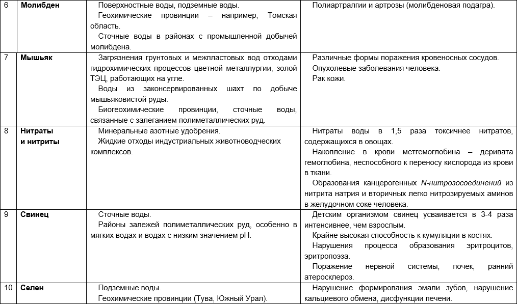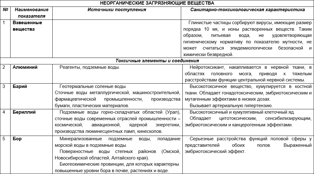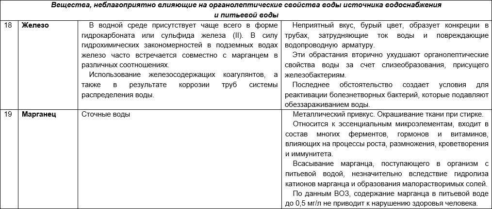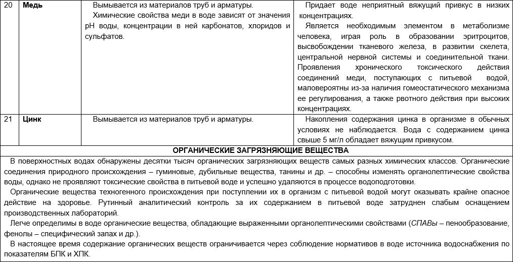 Санитарно-гигиенические риски присутствия в воде различных загрязняющих веществ приведены в таблице 3 (составлена кафедрой экологии человека и гигиены окружающей среды, Первый МГМУ им. И. М. Сеченова).