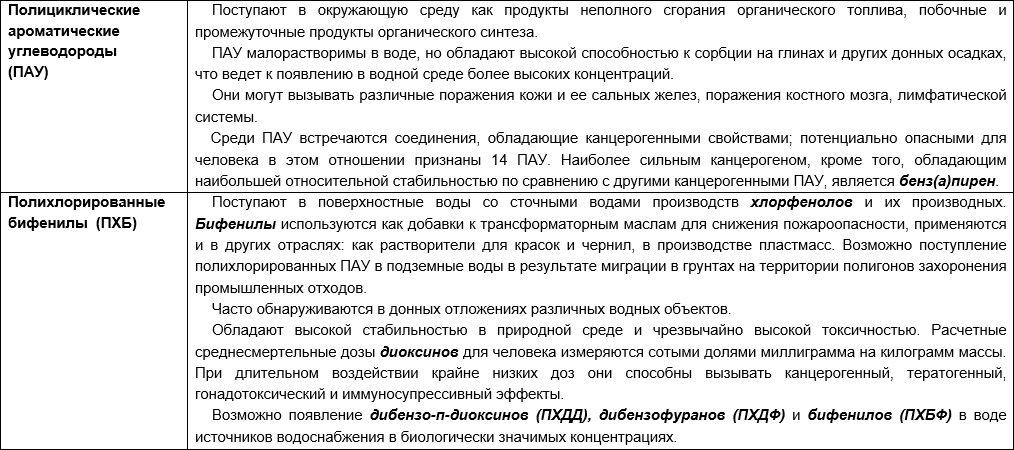 Наряду с этими соединениями ученые-гигиенисты отмечают наличие загрязняющих веществ в водных объектах, которые оказывают на организм специфическое «отложенное» воздействие. А именно: токсические эффекты проявляются не сразу, а в отдаленные от экспозиции периоды жизни. Причем часто речь идет о годах и даже десятилетиях. Еще серьезнее для общества проявление неблагоприятных эффектов в последующих поколениях.