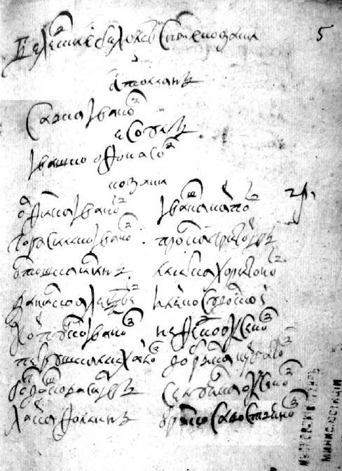 Алфимка Иванов, Ивашка Карпов, Горасимко Иванов, Пронка Григорьев, Онтошка Илин, Митка Хоритонов, Данилка Алексеев, Илейка Суволскай, Корпушка Иванов, Нефедко Оксенов, Петрушка Михайлов, Добрынка Курбатов, Богдашкло Васильев, Селуянко Оксенов, Ларка Фомин, Обрамко Савостьянов, (л.5об.) Марчка Григорьев, Ивашко Степанин, Ивашко Ондреев Посок, Якушка Омельянов Чуфрин, Тимошка Яковлев, Микифорко Осипов, Ивашко Фомин, Гришко Федоров, Кондрашко Максимов, Ивашка Перфильев, Онисимко Омельянов, Мишко Федоров, Гришка Ондреев Рылва, Евсейко Иванов, Гаврилка Карпов, Ивашко Дементьев, Влатко Дмитриев, Вадка Иванов, Осипко Яковлев, Ивашко Нестеров, Федка Яковлев, Офонка Василев, Гришка Иванов, Мишка Проскуряк, (л.6) Юшко Иванов Булка, Терешко Ульянов, Васка Петров, Ларка Иванов, Кирилка Горасимов, Юнинка Иванов, Филипко Григорьев, Осташко Ласакитин, Кондрашко Ризин, Микифорко Иванов, Офонка Тимофеев, Васка Болаш, Микитка Самойлов, Кондрашка Петров, Петрушка Иванов, Куземка Ризин, Ивашка Онтипов, Ивашко Михайлов, (л.6об.) Илейко Осипов, Максимко Федоров, Куземко Фомин, Максимка Вдовов.