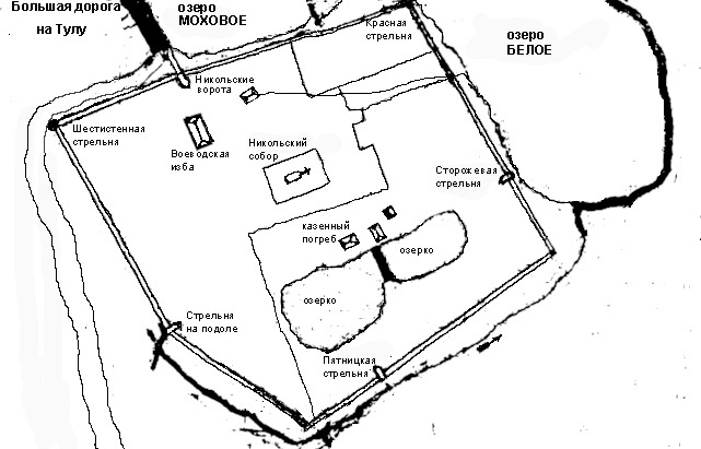 И всего осадных 20 дворов, а в них 13 человек дворников, да 23 места дворов. В городе же дворы поповские: Никольского собора попов, да дьякона, Да Пятницкого попа из Луговой, да Орхангельского попа из-за Шивроны, двор Егорьевского попа и два из Ямской слободы, места дворов Покровского попа из Стрелецкой слободы, да Спасского попа, да Архангельского попа из Шата, Дергилевской слободы, с Батурки, казака Малика Иванова, да сторожевого казака Тихона Деева… Внутри города клети и места клетные Дедиловских стрельцов, вшод в город в Никольские ворота направо у городской стены, стрельцов 13 клетей, да 37 мест клетей. Внутри города клети и места клетные Дедиловских пушкарей, 15 клетей, Дедиловских затинщиков 21 клеть и 5 мест, Дедиловских охотников, Внутри ж города клети и места клетные Дедиловских казаков Луговой и Дергилевской сотни, всего дворов, осадной да 2 избы, да 118 клетей да 28 мест клетей».