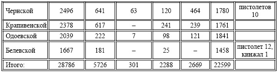 Из этих денег 2000 руб. были израсходованы на приобретение оружия для ополчения. По расценкам того времени на них можно было приобрести около 600–700 ружей. Остальные средства должны были пойти на обмундирование и провиант. Среди дворян нашлось очень большое количество желающих вступить в милицию. Непосредственным начальником Тульской милиции был избран генерал-лейтенант князь Николай Волконский, тысячными командирами: флота капитан I ранга кавалер Петр Хомутов, полковник Глебов и подполковник Михаил Данилов. Кроме того, были выбраны 12 пятисотенных и 120 сотенных и пятисотенных начальников. В случае невозможности избранными выполнять свои обязанности были выбраны заместители («кандидаты»). Наряду с обычными милицейскими частями в губернии формировался подвижной батальон, состоявший из 6 рот. Его возглавил полковник Родион Крюков. Всего же по стране в милиции было 612 тыс. чел.