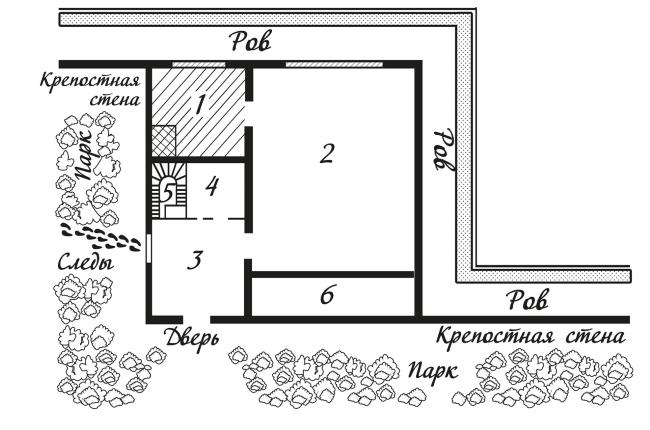 Впрочем, я познакомлю вас сейчас с планом этого флигеля. Дом имел всего один этаж, куда вели несколько ступенек, и довольно высокий чердак, который не представляет для нас никакого интереса. Поэтому я предлагаю читателю наипростейший план первого этажа: