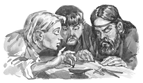 Платов из Тулы уехал, а оружейники три человека, самые искусные из них, один косой левша, на щеке пятно родимое, а на висках волосья при ученье выдраны, попрощались с товарищами и с своими домашними да, ничего никому не сказывая, взяли сумочки, положили туда что нужно съестного и скрылись из города.