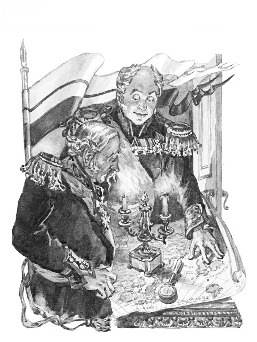 Платов ничего государю не ответил, только свой грабоватый[2] нос в лохматую бурку спустил, а пришёл в свою квартиру, велел денщику подать из погребца фляжку кавказской водки-кислярки[3], дерябнул хороший стакан, на дорожний складень[4] Богу помолился, буркой укрылся и захрапел так, что во всём доме англичанам никому спать нельзя было. Думал: утро ночи мудренее.