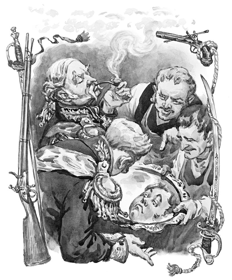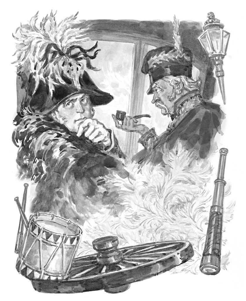 Государь оглядывается на Платова: очень ли он удивлён и на что смотрит; а тот идёт глаза опустивши, как будто ничего не видит, – только из усов кольца вьёт.