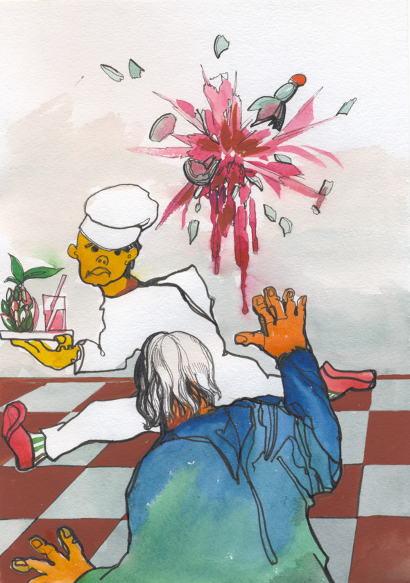 После этих слов он взял самую тёмную бутылку ликёра и с силой швырнул её в белоснежную стену. Бутылка с грохотом разбилась о стену! Сотни осколков со звоном посыпались на пол. Несколько поваров с ужасом обернулись, услышав шум битой посуды, некоторые кухонные работники недоумённо моргали глазами, не понимая, что происходит. Все глянули на белоснежную стенку и ахнули!! Лишь владелец ресторана стоял с невозмутимым лицом. Художник внимательно смотрел на стену, слегка прищурив глаза, и поворачивал голову то вправо, то влево, слегка наклоняя её то к одному, то к другому плечу, как бы любуясь кроваво-багровым пятном. Затем он метнул в стену несколько банок сметаны, бутылку соуса и кетчупа, немного баклажанной икры, морковного салата с майонезом и, наконец, пару банок зелёного горошка! Повара с ужасом смотрели за происходящим, лишь мальчишка-поварёшка радостно улыбался. Художник взял ёршик для мытья посуды, который, в данном случае, выполнял роль кисточки, и стал моделировать образовавшиеся пятна. Сибириак продолжал наблюдать за работой художника с невозмутимым видом.