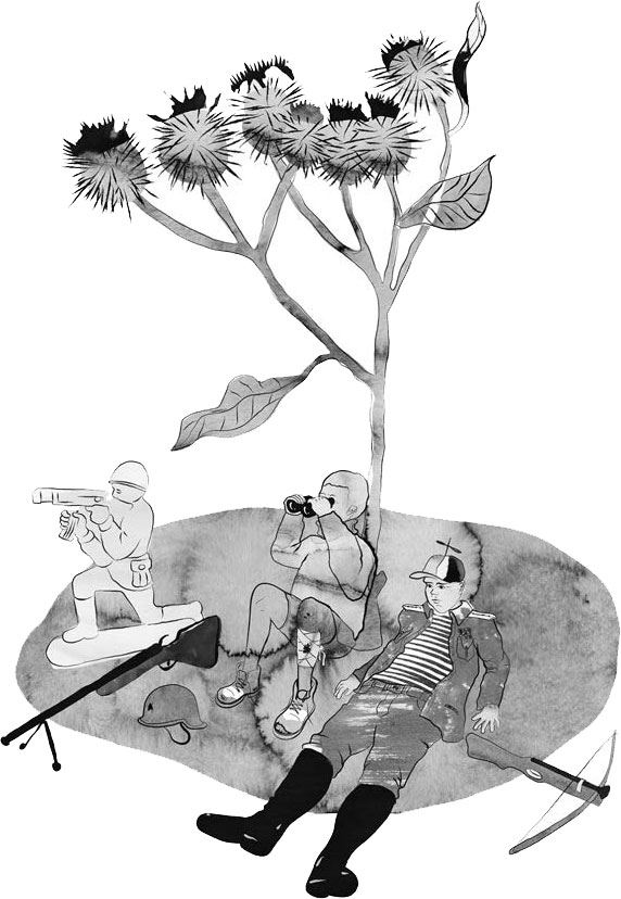 На этих словах Саня достал три ветки репейника. Где достал он этот репейник, было тайной. За тем полем, что за стройкой, что за новостройкой, за пустырем, где когда-то Мишка нашел мертвую собаку и звал друзей потыкать палками, там – чу! – шебуршала мухоедка, там ухал вывертень и разбубелось стрекомысло. В том поле разгулялась гуляля, ветрилось ветрило и барахталось барахтало. Туда не ступала нога, только раз у пьяницы ступала, когда сломался автопилот и он промазал мимо обычных кустов, да и то потом не вспомнил, как туда попал. Там на сопке рос чичажник, цвел мантульник, колосился загогульник и чиграк, там благоухал волчий локоть и зарыл свою кость самоед, а нашла голодная такса, наполненная таксятами, и лежала всякая барахля, оставшаяся от былых стоянок человека. Там под землей, на глубине, были зарыты сопли мамонта и скальп индейского вождя, ждущие своих археологов, там шуршал безвредень и, как лиловая клевретка, лелелась аполлонница, короче, вам туда не пробраться, не дойти, и не надо трали-вали, там трава и так густа. Вот, короче, там и цвел репейник, и туда Саня Ладо приканал, чтобы его набрать. И теперь прилипал тот репейник к плечам ребят: кому-то три головки, кому-то четыре, кому-то одна, но жирная. Кто был генералиссимусом, а кто всего лишь маршалом. Так и появилась Армия Репейника.