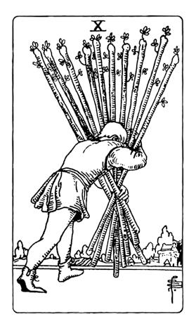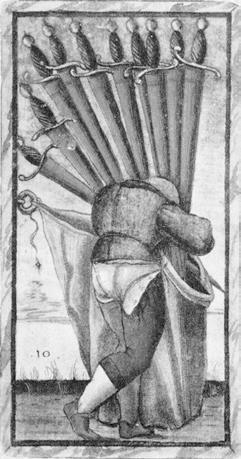 Рис. 1. Десятка Мечей Таро Сола-Буска (слева) стала прообразом Десятки Жезлов Таро Уэйта