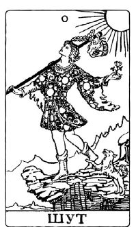Этот Аркан имеет следующие названия: Шут, Дурак, Глупец. Мы будем оперировать названием «Шут». На карте изображен неряшливо одетый человек, странник, что, с одной стороны, обозначает путь, с другой – безрассудство, нелогичность и путешествие без определенной цели. Шут ищет себя подобно странствующему средневековому актеру или юродивому.