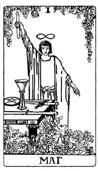 В более ранних колодах именно этот Старший Аркан, а не Шут, открывал колоду. Имеет следующие названия – Маг или Фокусник. Мы будем оперировать названием «Маг». На карте изображен персонаж средневековых ярмарок – наперсточник, развлекающий публику фокусами и различными трюками. Впоследствии в рамках системы Таро Уэйта он трансформировался в мага, владеющего искусством управления четырьмя стихиями (Огонь, Вода, Земля, Воздух).