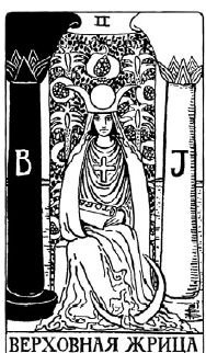 Второй Старший Аркан – Верховная Жрица, Папесса, Монахиня. Образ целомудренной монахини связан с легендой о женщине-понтифике (Папе Римском). Скрытая под слоями помпезного папского убранства и увенчанная папской тиарой, Верховная Жрица символизирует тайное знание, закрытость от внешнего мира и погруженность в духовные вопросы. Жрица является олицетворением всего эзотерического, оккультного, мистического в противовес христианскому, официальному церковному.